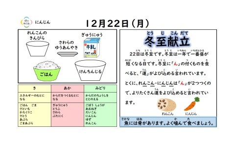 今日は「冬至」です。一年で最も昼が短く,夜が長くなる一日です。冬至は「ん」のつく食べ物(カボチャ(なんきん)など)を食べ,ゆず湯に入って邪気を払い,無病息災を願う習慣があります。
