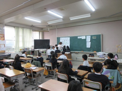 1組は国語「お話しのさくしゃになろう」の学習をしていました。「どんな風に書けば面白くなるかな?」みんなで考えていました。