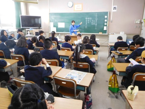 2組は国語です。「三年とうげ」と「季節のことば」の漢字テストをしています。