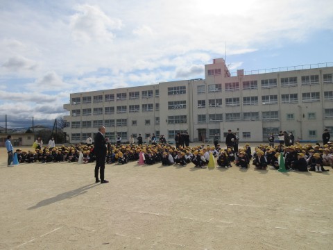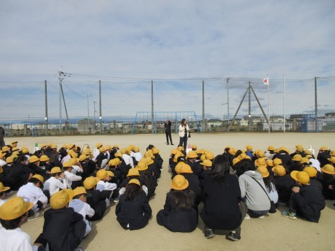 運動場に集まったら担任の先生の,人員点呼です。「1名行方不明」という避難訓練の想定にしています。ここからは先生たちの訓練です。もし,一名子どもが集合場所に集まらなかったら?救助班の先生方で学校中を捜索しました。その間も,児童は先生の話を聞きながら静かに待ちます。無事に保護。職員室で治療を受けているという設定で,本日の避難訓練は終了。最後に校長先生から「自分の身を自分で守る方法,しっかり考えることができていましたよ。静かに話を聞いている姿も真剣でとっても良かったです」とほめていただきました。