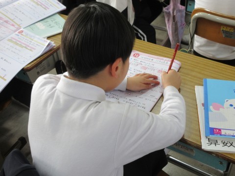 1組は算数。大きな数の学習です。ワークの隙間に自分で位取り表を書いて考えている人もいましたよ☺