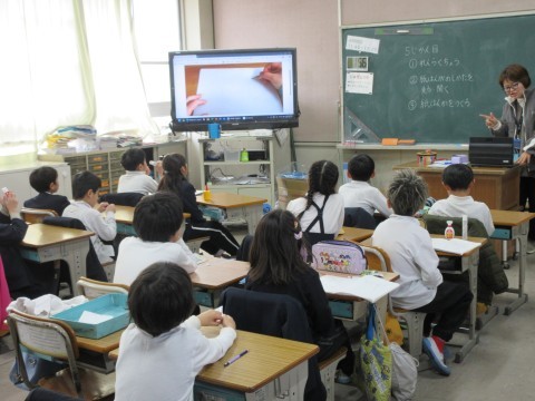 2組は図工。紙版画の進め方を動画で確認していました。作り始めるのが楽しみですね♪