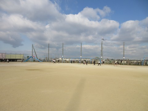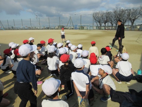 2年生は合同で体育をしていました。ボールをキックしながら運動場を一周した後,ボールを蹴るとき,どこで蹴るとコントロールがいいのかな?みんなで考えていました。