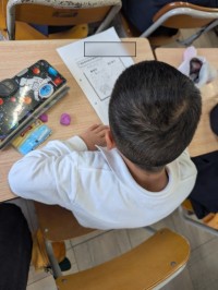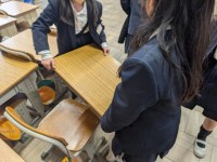 給食の先生が来てくれて,調理員さんの仕事を教えてくれました。500人ぐらいの給食を8人で作ってくれているということに,みんなびっくり!!たくさんの野菜を切ったり,調味料を混ぜたり,片付けしたりと大忙しだけど,毎日みんなが「おいしい」と言ってくれるのを楽しみにしながら作ってくれているそうです。お話を聞いたあと,実際に使っている「おたま」を持つ体験などをさせてもらいました。みんなのおうちにある用具と比べると,全然違うよね。「こんな大きなので混ぜるの,力いるな」と感心していました。おいしい給食を作ってくれている調理員さんに,感謝の気持ちでいっぱいになった1時間でした。