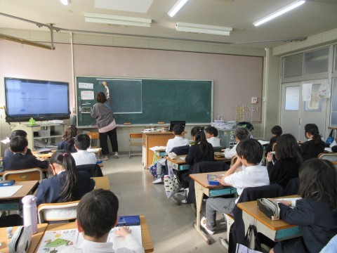 2組は算数。長さの問題に取り組んでいました。