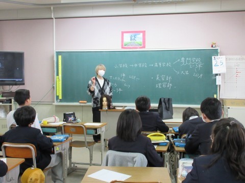 3組はキャリア教育。美容師さんをゲストティチャーに迎え,職業について学んでいます✂