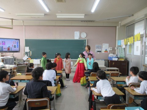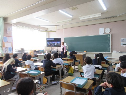 3時間目は1組がモンゴルについての授業です。李先生から,モンゴルの様子を教えてもらいます。大草原ばかりかと思ったら,とっても近代的な建物もたくさんあってびっくり!「日本みたい💗」とつぶやく児童もいました。でも夜になると,きれいな夜景の向こうの奥は真っ暗です。「都会」と「草原」の違いがよく分かりました。