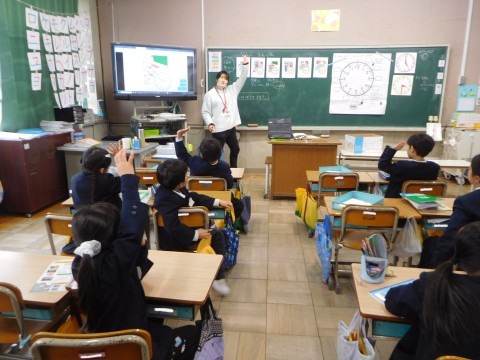どちらのクラスも算数の時間です。時計の学習をしています。