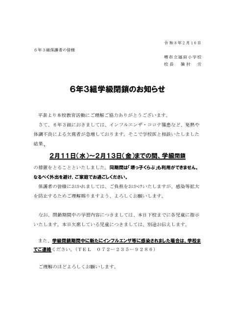2/10 6年3組学級閉鎖について