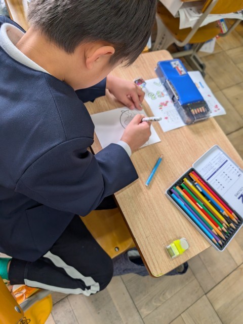 いよいよ,1年生の生活もあと2ヶ月をきりました。次はみんなが,新1年生をお迎えする番になってきましたね。今日は,ドキドキしている新1年生にプレゼントを作りました。みんなからのメッセージつきです。「カタカナはまだ習ってないから,ひらがなで書いてあげないと」と,さっそく素敵な言葉が飛び出しました。丁寧に色塗りをする姿も,さすがお兄さん・お姉さんです。まだ途中ですが,みんなの心温まるメッセージがとても感動しました。頑張って完成させようね!!