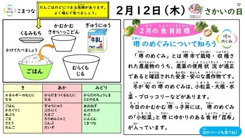 今日の給食は「さかいの日」献立でした。堺市で取れた野菜やお米などをたくさん使ったメニューです。「かむかむさかいっこどん」は小松菜やにんじん,昆布やちりめんじゃこ,ゴマなどたくさん具材が入っていて栄養満点!ご飯にかけていただきます!「くるみもち」も堺では有名ですね💗