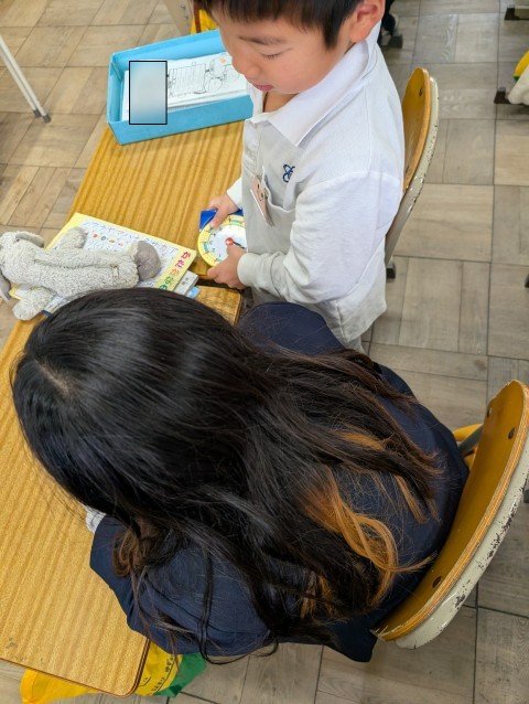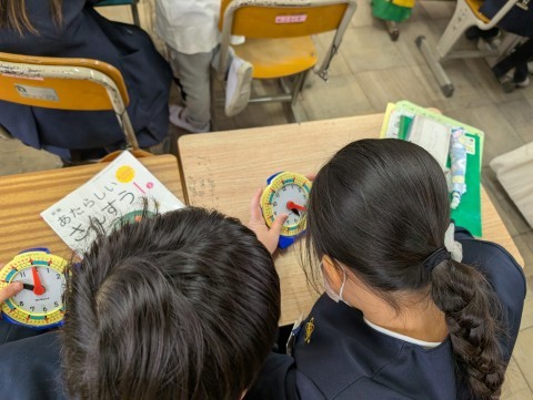 時計の学習をしています。短い針が,何分をさすのかがまだ難しいよね。慣れるまでは,1分2分・・と数えていくといいので落ち着いて解いていこうね。自分たちの時計を使って,友だちと問題を出し合いました。「これは何時何分でしょう?」「正解!!」「惜しい!」などあちこちで声がしていました。これから,自分で時計を見て行動していきたいね。
