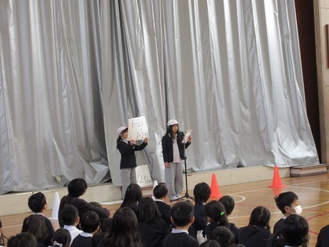 その後,児童会役員さんから「だるまさんがころんだ大会」の説明がありました。ペア学年で明日から順番に「だるまさんがころんだ」を体育館で行います。そのお手本を見せてくれました。とっても楽しみですね!