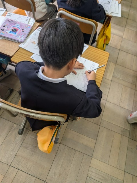 今日のめあては,書き順や形に気をつけて書こうでした。それぞれの漢字を形とく書くには,書き順も関係してくるんだね。教科書には,もう一度正しい書き順が載っていたので,みんなで確認しながら進めました。どこの画数のところを長く書くのかも丁寧に見ていました。1年生の書写の時間もあと少しです。ここで習ったことを他の教科でも活かしていきたいね!!
