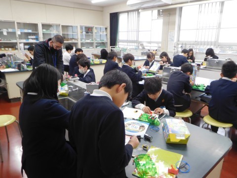 1組は理科です。電流と電磁石の学習につながる車を作成しています。