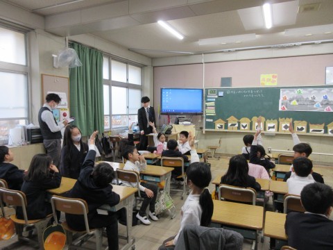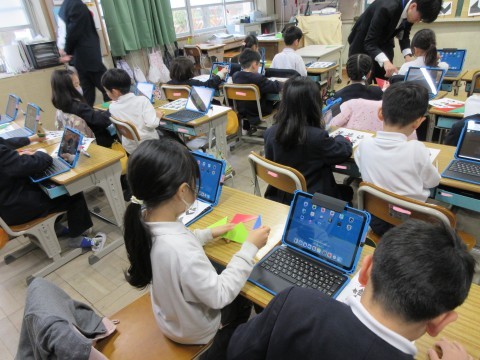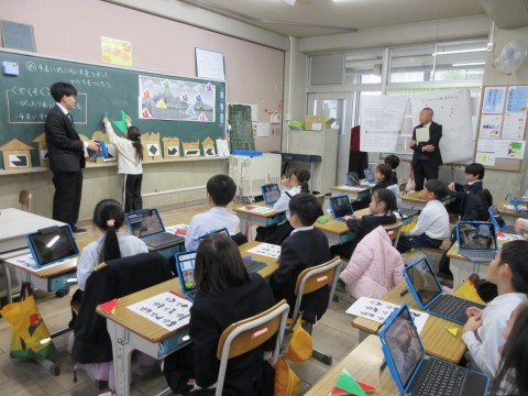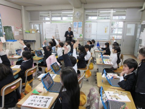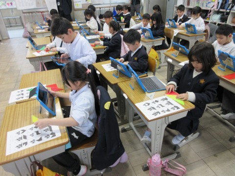 2時間目に算数の「かたちづくり」の公開授業研がありました。4枚の色板を使っていろいろな形を作ります。