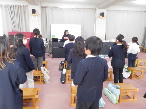 1組は音楽です。明日の「6年生を送る会」の練習をしています。