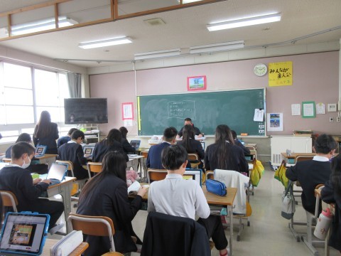 3組は外国語。「心に残った学校行事」を発表するための資料作りです。