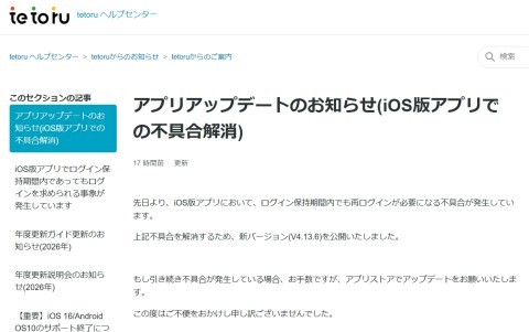 【情報提供】tetoruアプリアップデートのお知らせ(iOS版アプリでの不具合解消)