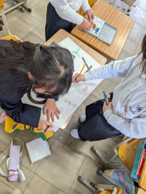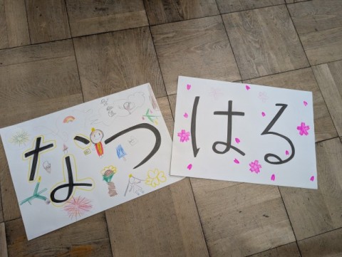 お迎え会の練習をしています。そのお迎え会で使う看板を作ってくれました。「春って,どんなイメージ?」という会話から,何人かで描いてくれています。それぞれの季節感が出ていて,とても素敵ですね。