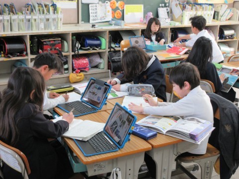 2組は国語。本やipadを使ってロボットについて調べ,説明する文章を書き始めていました✐「先生見て!サッカーできるロボットもいる!」と,大興奮で教えてくれました☺