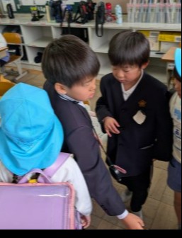「そうじチーム」は,靴箱や廊下でほうきの使い方を教えてあげたり,一緒にミニほうきで掃除をしたりしていました。「教室の部屋チーム」は,ランドセルを背負って観察池など実際に,学校探検に連れていってあげていました。どのチームも楽しんでもらおうと,一生懸命でした。最後の感想タイムでは,「たくさんできて楽しかった」と言ってくれました。1年生にとっては,最高の言葉ですね。プレゼントも渡して,お見送りもしました。「みんなが笑顔で帰ってくれたのが,嬉しかったです」「学校に来るの楽しみって言ってくれたよ」と1年生。みんなにとっても,年長さんにとっても,素敵な時間になったと思います。それぞれのチームが,たくさんのアイデアを出して,盛り上げてくれたからだね。とてもかっこいい1年生でした!!2年生になっても,新1年生のことよろしくね!!みんなに大きな花丸です!!