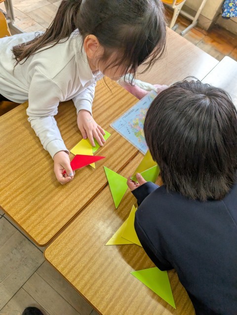 色板を使って,様々な形を作ってみました。最初は,色板を2枚使って三角や四角を作り,そのあとはどんどん枚数を増やしたりしていきました。「なるほど!」というアイデアがたくさんありました。色板を使って,また勉強していこうね!!