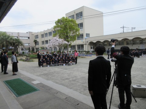 入学式後,雨がやんで,風も収まっていたので外でクラス写真を撮影しました。かろうじて残っている桜の木の下です🌸