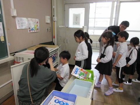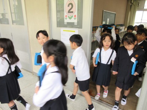 前の学級に戻り,自分のタブレットや充電器を受け取ります。