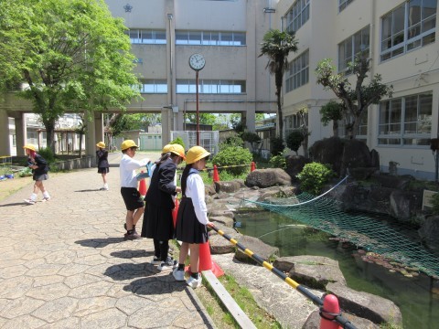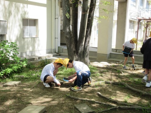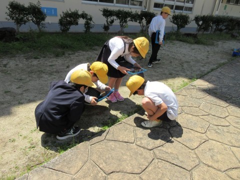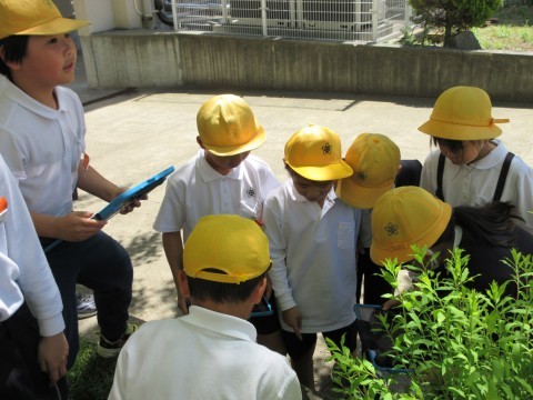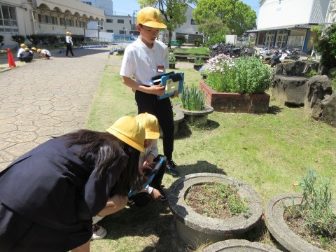 そんな日差しの中,4年生が中庭で「春みつけ」をしていました。てんとう虫や幼虫,きれいに咲いている花などを見つけて,タブレットで写真を撮っています🐞