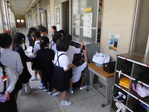 1組は、廊下のロッカーの使い方の確認をしています。
