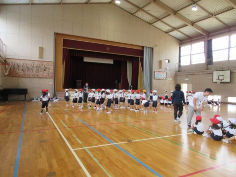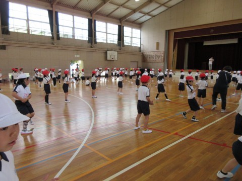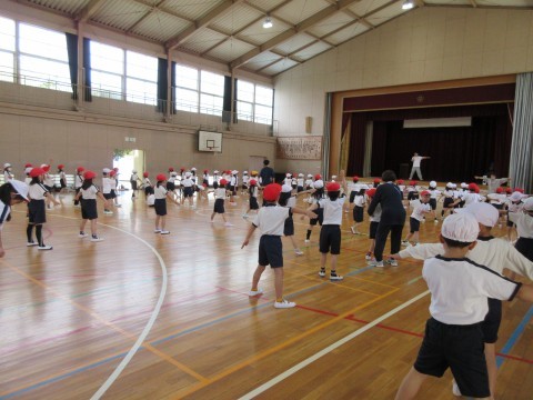1・2年生も体育大会に向けて合同練習が始まりました。初めて体育館で一緒に体育をします。