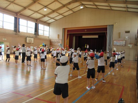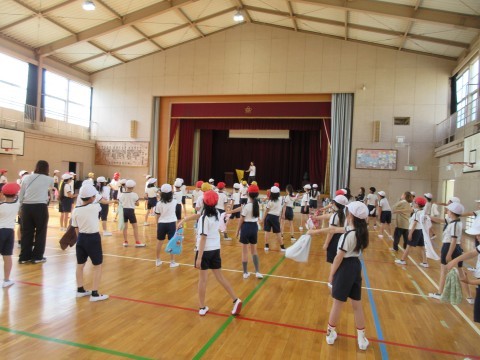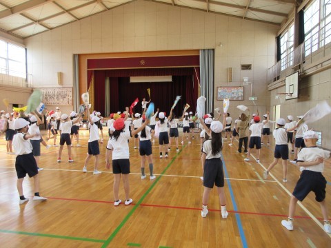 5年生も体育大会の団体演技に向けた練習が始まりました。タオルをフラッグに見立てて練習していました。