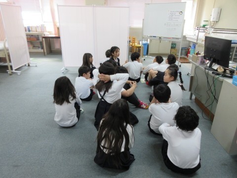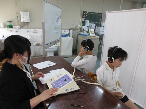 保健室を覗くと,ちょうど3年生が聴力検査をしていました。