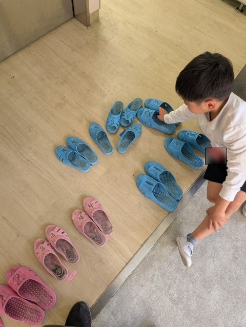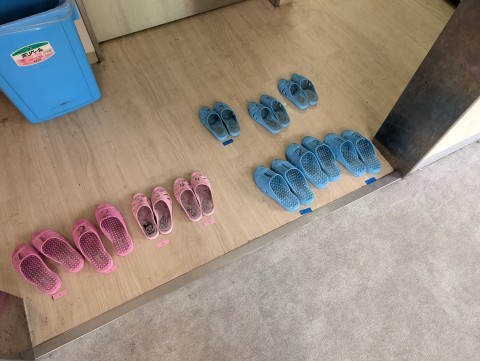 トイレの前を通りかかると,こんなふうにきれいにしてくれていた人がいました。そのあとも,「先生,みんなの分を揃えてきたよ!」と教えてくれる人もいました。素敵な心だね。4月の生活目標は,「はあともみじを身につけよう」でした。その中の「と」は,「トイレのスリッパ くつばこきれい」という合言葉です。みんな意識してくれているんだね!!先生たちの心も温かくなりました。
