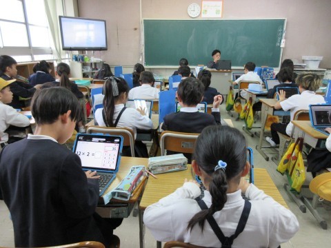 1組はタブレットを使って学習中。キーボードを早く打てるように練習したり,計算問題に取り組んだりしていました。