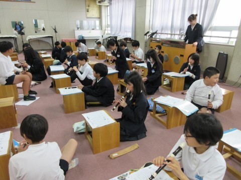 1組は音楽。リコーダーの練習です。シの♭も出てきてリズムも難しい「ラバーコンチェルト」🎵練習頑張って,きれいな音色を聴かせてね🎵