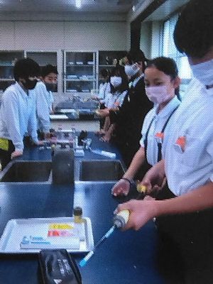 気体検知管を使って教室の酸素濃度を測りました。初めての経験でみんな少し緊張していました。