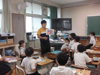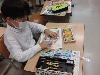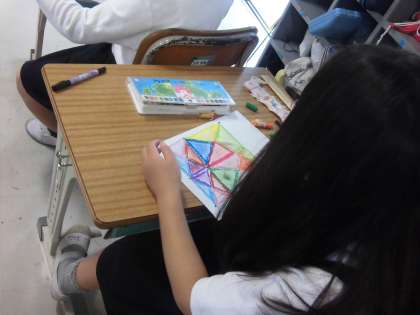 決められた数の点を線でつないで,できた形に色を塗っていきます。ステンドグラスのようできれいですね。