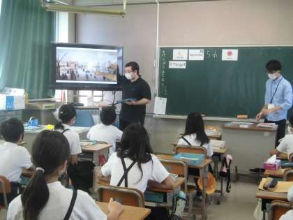 夏休みの過ごし方について英語で話し合います。NSの先生は美術館や天王寺公園に行ったことを話してくれました。
