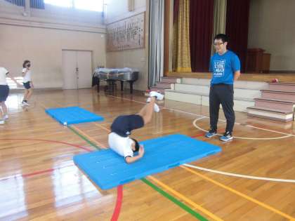 体育では、後転の練習をしていました。先生からアドバイスをもらいました。