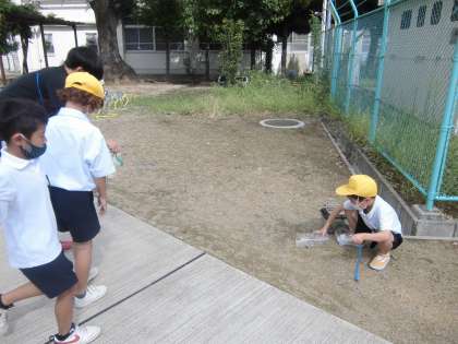 小さな生き物の観察や飼育に取り組んでいます。トカゲをとる罠を仕掛けましたがコオロギが捕まったので逃がしてあげました。