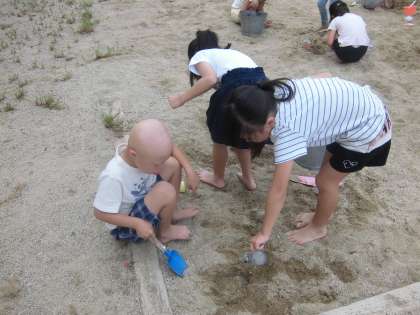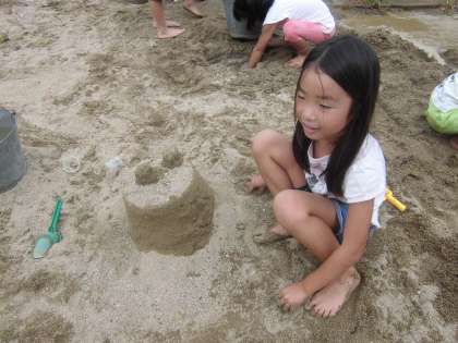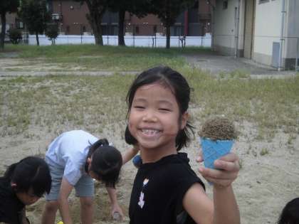 みんなで泥んこ遊びをしました。おだんごや動物の顔,大きな川や足湯など,自分たちで自由にものを作って遊んでいました。