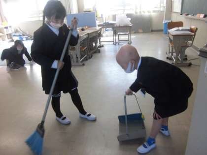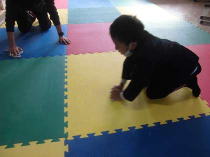 同じ掃除場所のお姉さんと協力して掃除を頑張っていました。 マット拭きもしてくれていました。