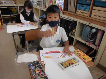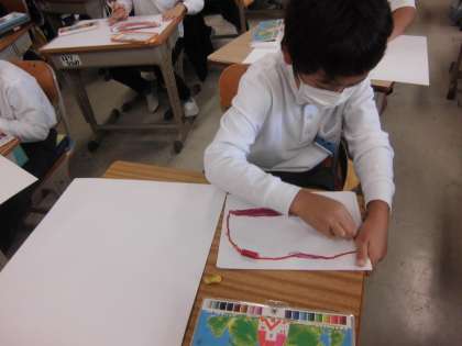 校外学習でとったサツマイモを描いています。色をとても工夫していました。