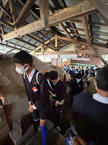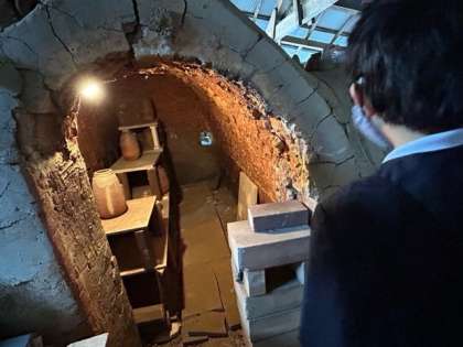 時間に余裕もできたので、焼き窯を見せていただきました!焼き上がった作品が中に飾られていました。4日間焼き続けるそうです。