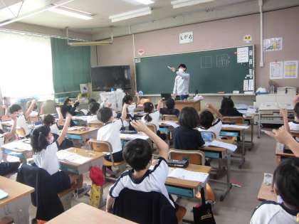みんなで教室に大きな文字を書いて漢字を学習しています。