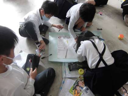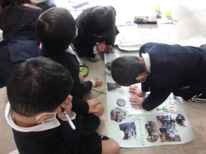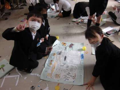 校区探検で知ったことをみんなで地図にまとめていきます。たくさんの発見や驚きがまとまっています。