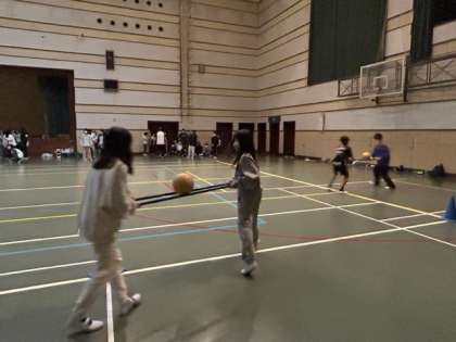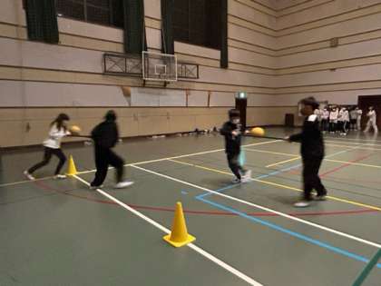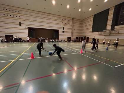 ボール運びリレーをしました。