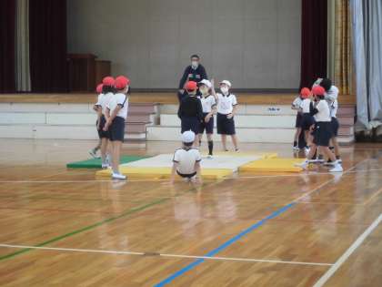 体育館ですもうをしました。まだ倒したり,足をかけたりはせずに安全に気を付けて取り組みます。